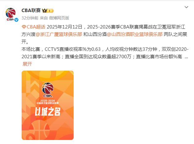 北京时间12月13日,CBA官方公布2025-26赛季揭幕战的收视情况,央视直播收视率创20-21赛季后近5年新高,全国观众人数超2700万,市场份额创近18年新高,而抖音直播总直播观看人次5001万。